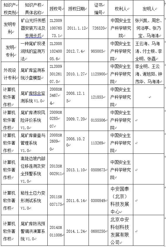 (3)张兴凯、马海涛共同完成了“矿山光纤传感器安装方法及专用卡爪”发明专利;王云海、马海涛、付士根、李全明共同完成了“一种尾矿坝浸润线的监测方法”发明专利。